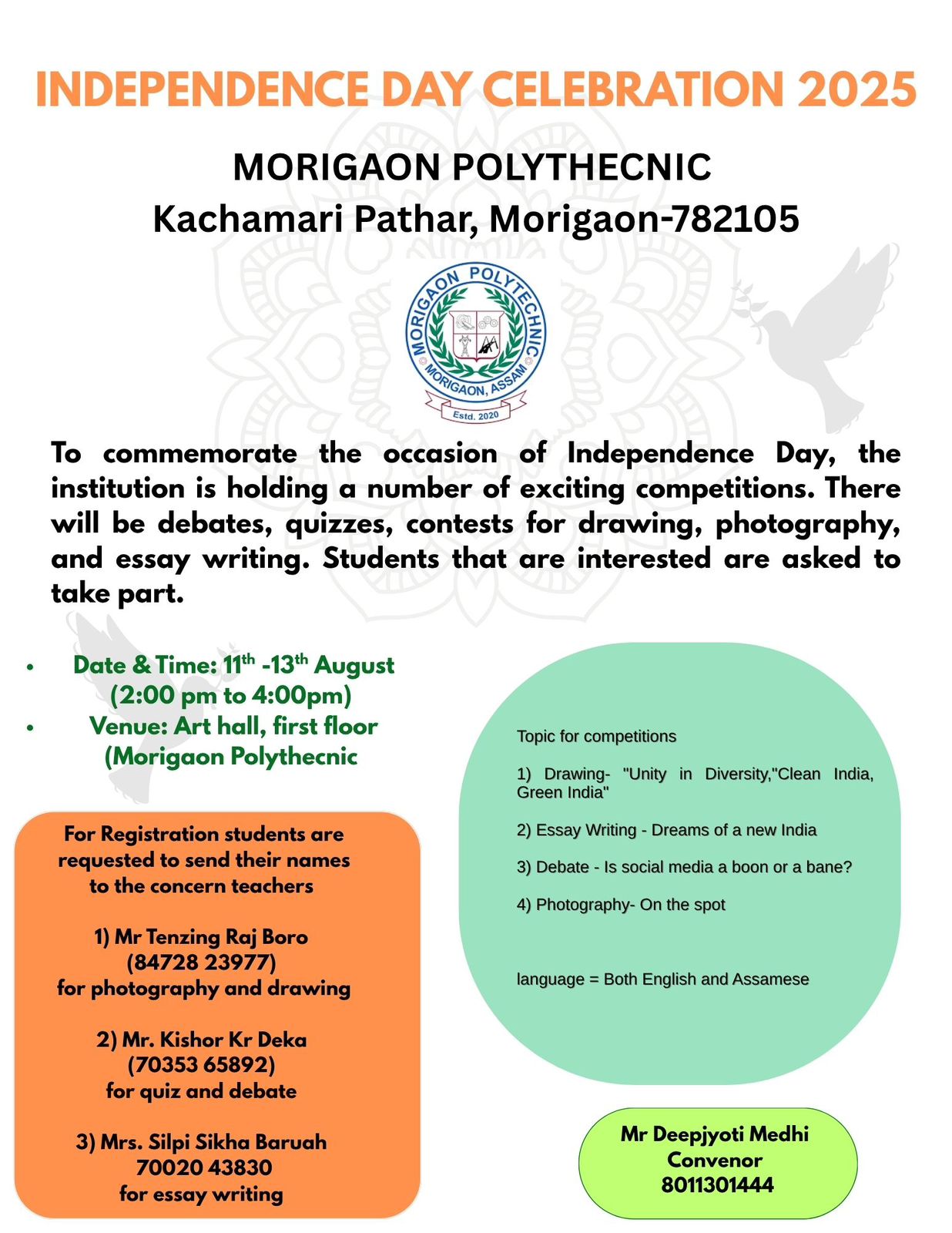 Morigaon Polytechnic was established in the year 2020 and is one of the five newly established polytechnic institutes in the state of Assam. The institute is located at Kachamari Pathar, to the north of Morigaon town in Morigaon district. It is situated approximately 3 km from Morigaon town and 26 km from Jagiroad railway station, with a travel time of about 10 minutes from the town.